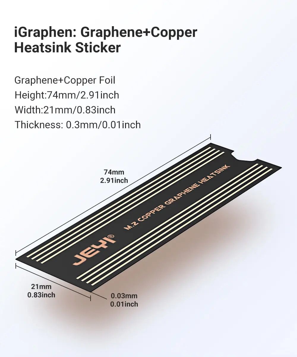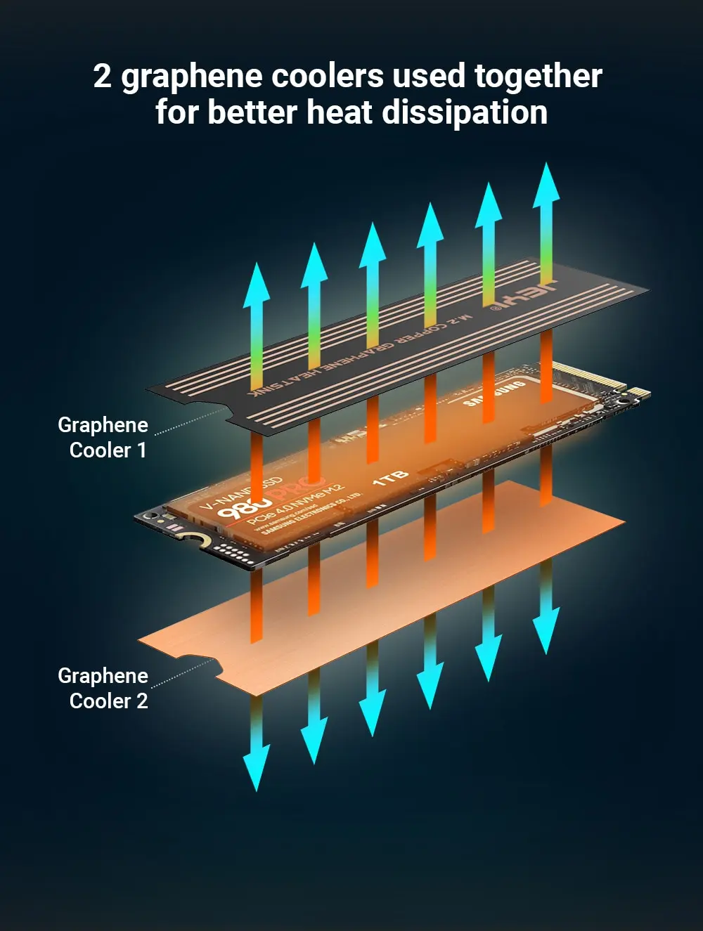 • Lámina de cobre grafeno :La lámina de cobre de grafeno proporciona una excelente conductividad térmica, asegurando que su SSD se mantenga fresco incluso durante cargas de trabajo intensas.